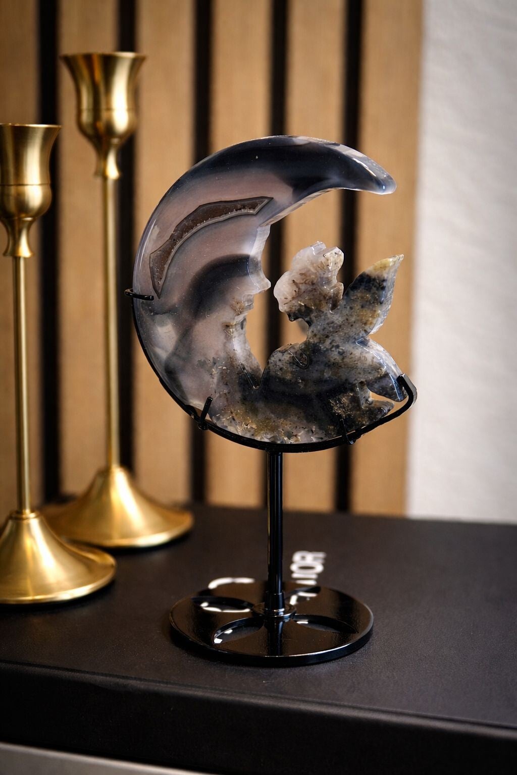 Mooie agaat in de form van een Maan met Elf op zwarte metalen standaard,